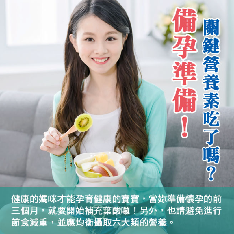 健康的媽咪才能孕育健康的健康寶寶,當妳準備懷孕時,請避免進行節食減重,應均衡攝取六大類的營養,可選擇天然的食品,減少高油脂、高熱量的飲食、避免煙燻加工的食物等,這些技巧有助妳調整出健康好體質,來迎接寶寶的降臨喔。